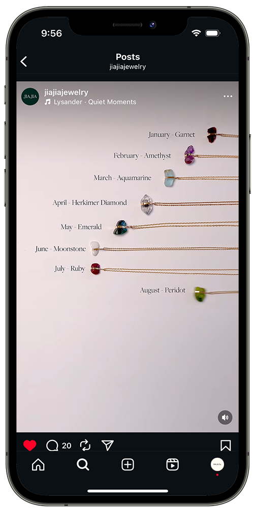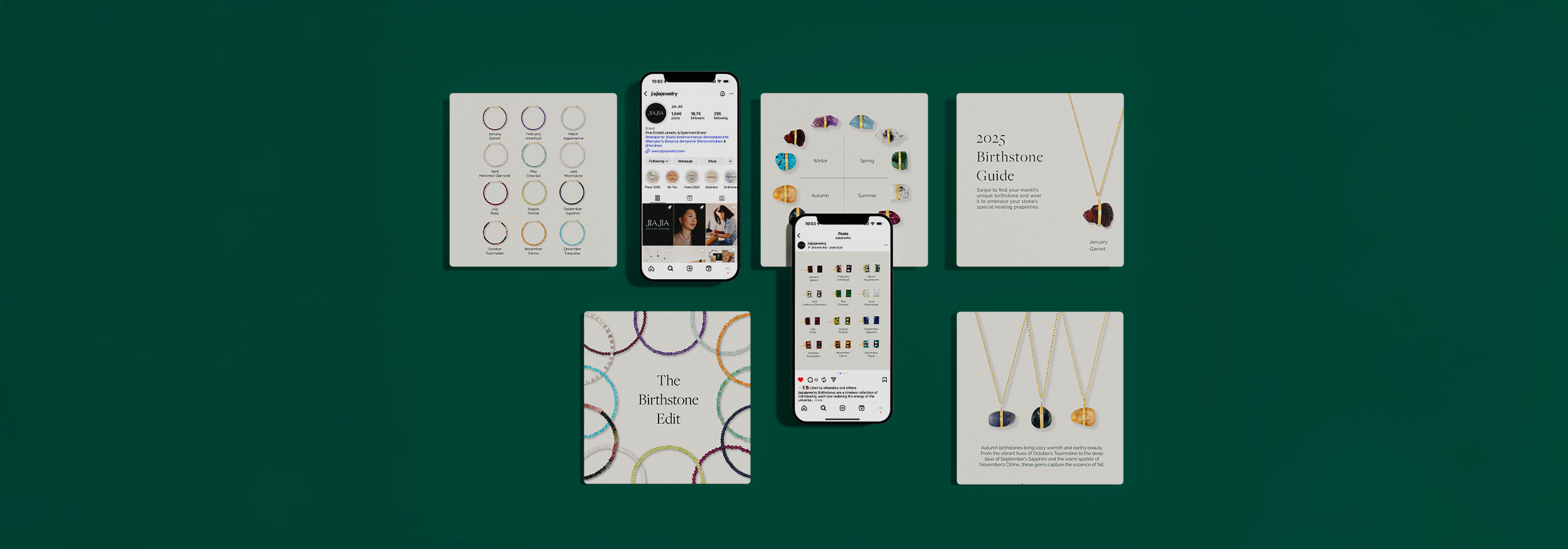 The Birthstone Guide campaign was created to highlight Jia Jia’s full collection of crystal birthstone pieces in a format designed for both beauty and performance. Developed to be shareable and saveable, the guides have quickly become one of the brand’s best-performing assets across social media channels, resonating with audiences through the satisfaction of seeing the complete collection presented together. Blending sharp visuals with strategy, the campaign reinforces the timeless appeal of birthstones while driving reach, engagement, and continued growth.