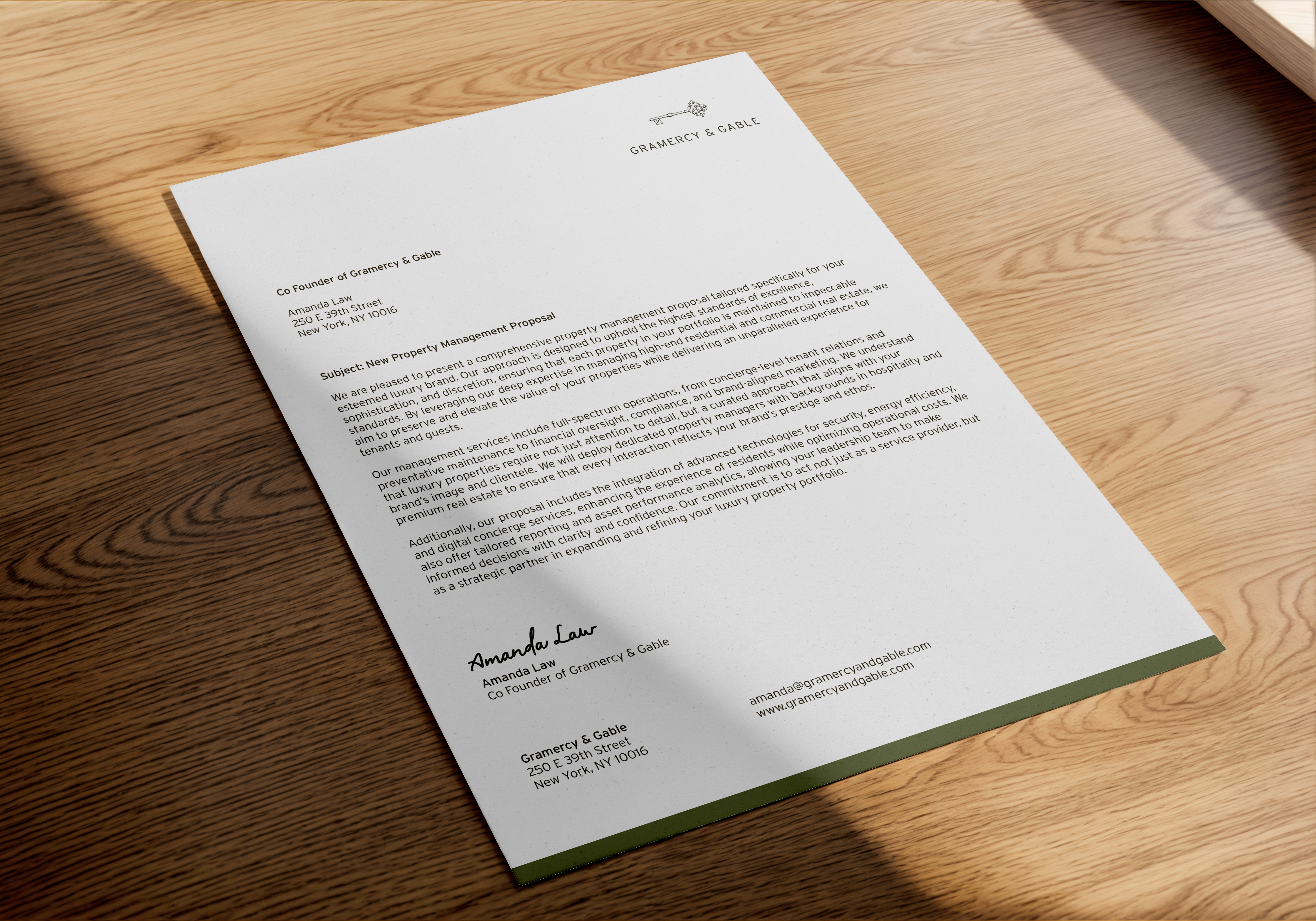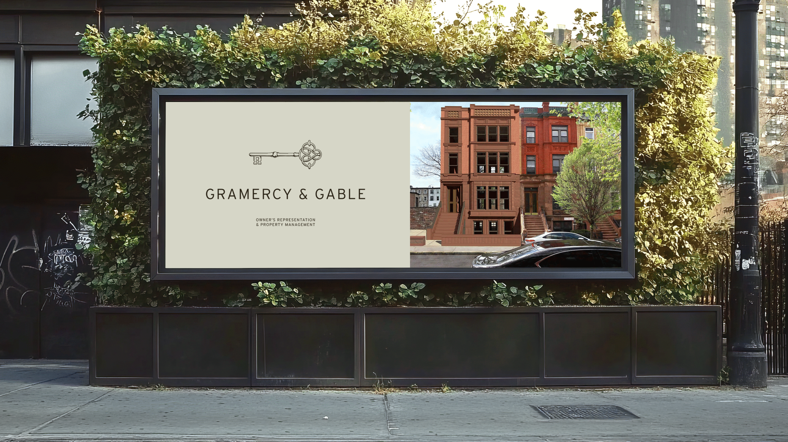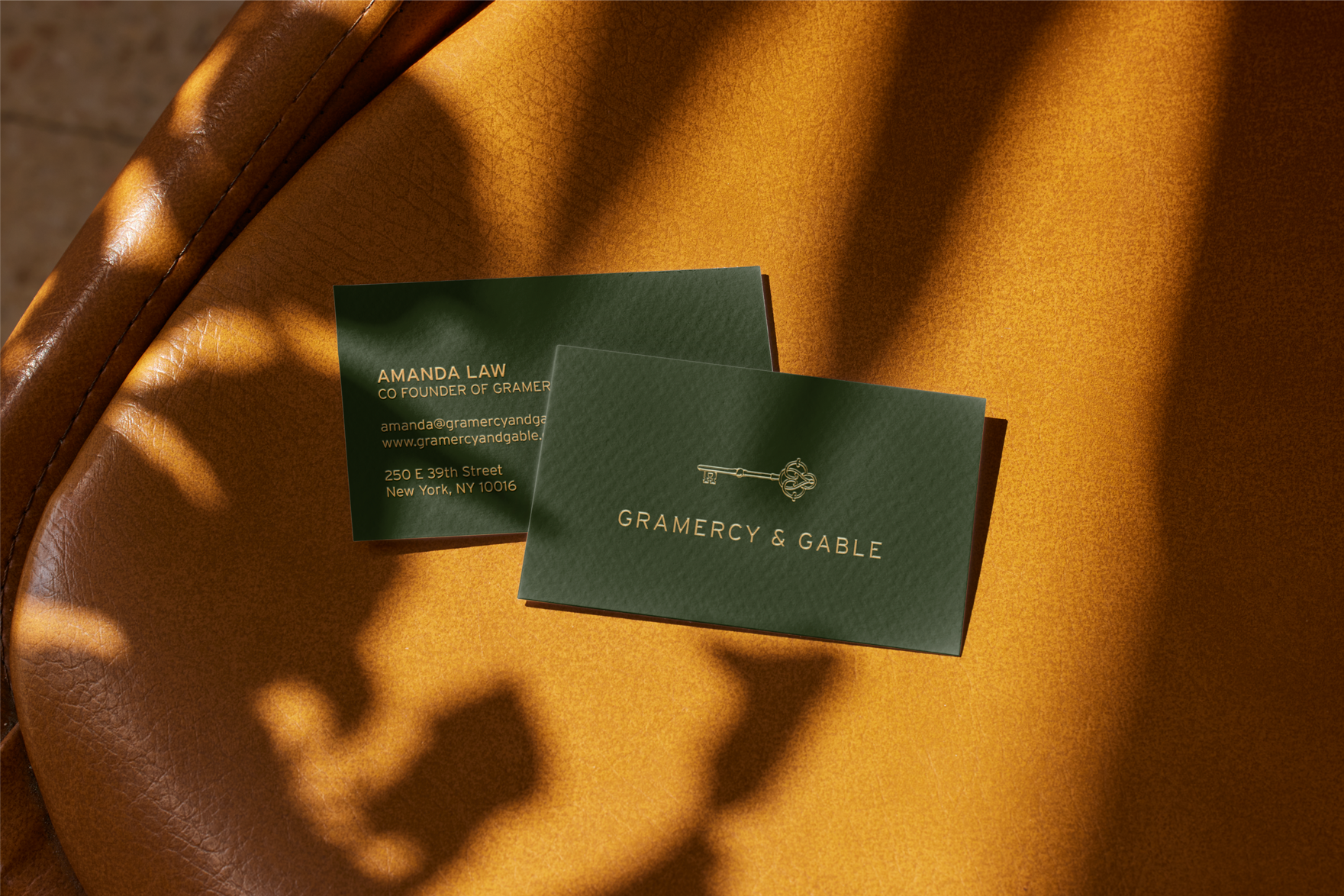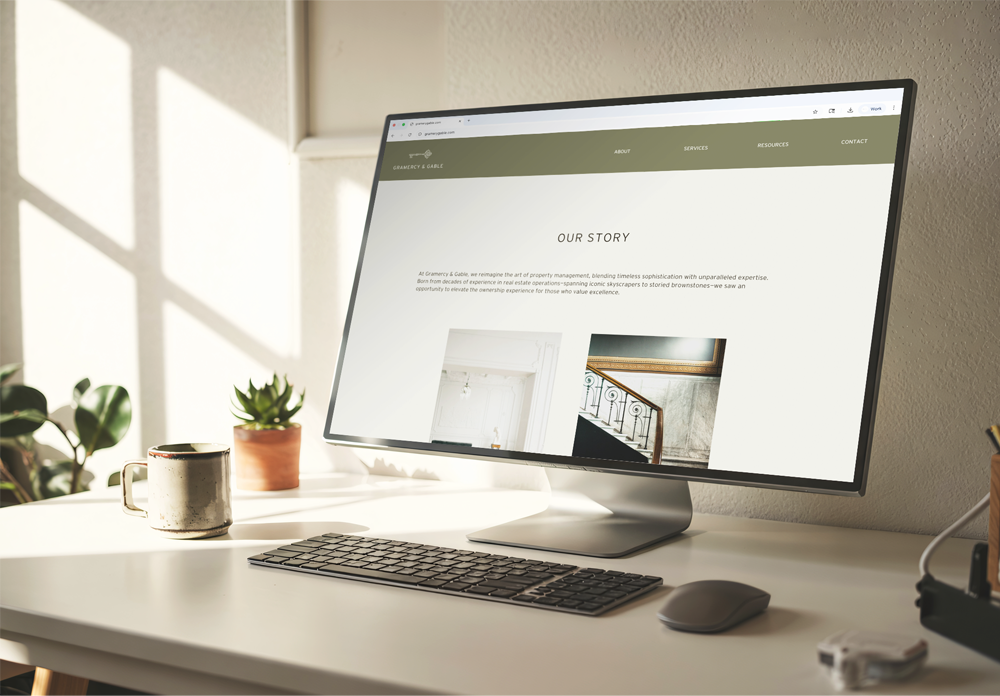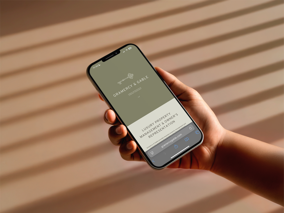 With a name like Gramercy & Gable, the logo naturally drew inspiration from New York’s exclusive Gramercy Park. The custom key symbol uses motifs from the park’s decorative wrought-iron gates and geometry from the aerial view of the landscape. The key’s head is formed by two mirrored “G”s, further giving the design a historic and bespoke feel, embodying both heritage and modern refinement.