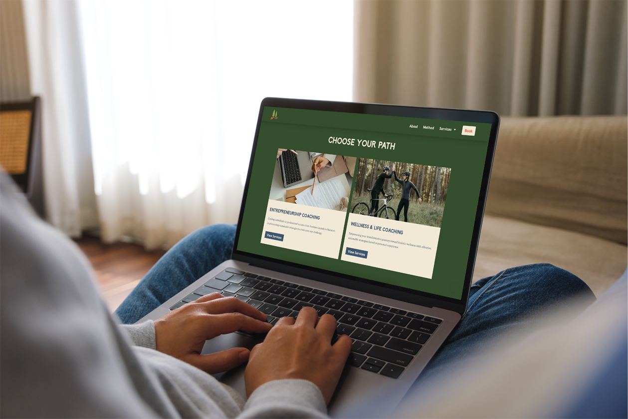 The logo draws from Rob’s core brand pillars of approachability, empowerment, professionalism, compassion, and wisdom. Two rounded tree forms represent coach and client, while a bright orange path winding between them symbolizes the journey toward growth. Paired with a bold sans serif wordmark, the identity captures both strength and warmth, and ensures Rob’s branding feels applicable in health, wellness, and business contexts.