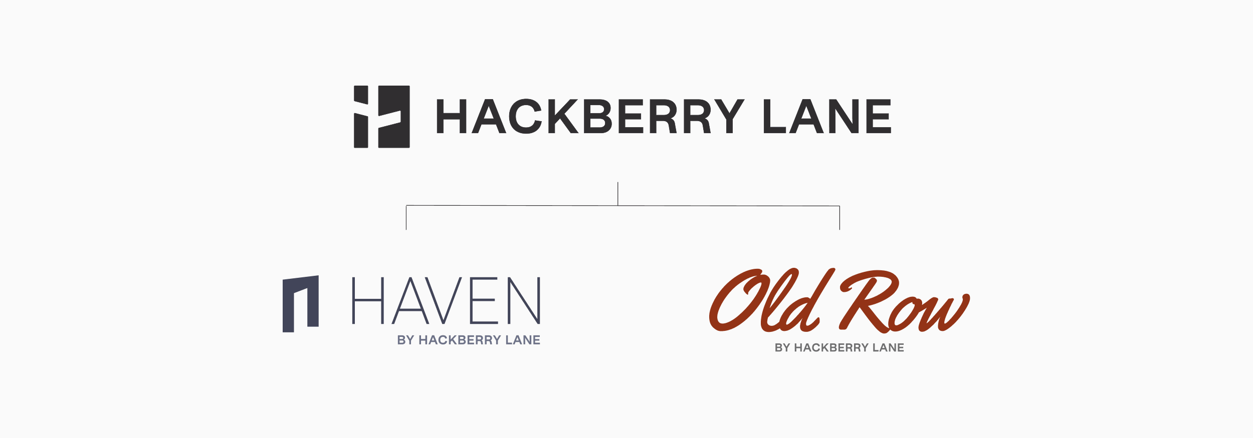 The design language draws from the authority of established real estate firms alongside the refined sensibility of modern, youth-driven brands. The Hackberry Lane symbol features a street sign embedded within the negative space of a rectangle, a reference to the brand’s origin on Hackberry Lane at the University of Alabama, while subtly forming an H that ties back to the brand name. Haven expresses a more elevated, serene approach to living through a calming purple palette and a clean, modern doorway symbol. Old Row leans into a legacy-driven, collegiate aesthetic, defined by a rust red tone, a more textured typographic style, and a classic Southern character that evokes heritage and tradition.